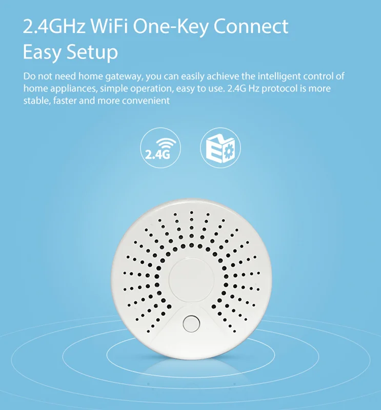 این سنسور در صورتی که دود در محلی جمع شود به سرعت آنرا تشخیص داده و آژیر آن به صدا در آمده و از طریق اپلیکیشن برای شما پیام ارسال میکند. همچنین اگر دمای محیط بدون وجود دود بیشتر از ۵۰ درجه سانتیگراد شود سریعا هشدار میدهد تا از وقوع آتش سوزی احتمالی جلوگیری کند. این سنسور نیاز به سیم کشی و کنترلر مرکزی ندارد بنابراین در هر مکانی که نیاز داشته باشید به راحتی میتوان از آن استفاده کرد و از طریق WiFi در اپلیکیشن اسمارت لایف یا تویا تعریف میشود.