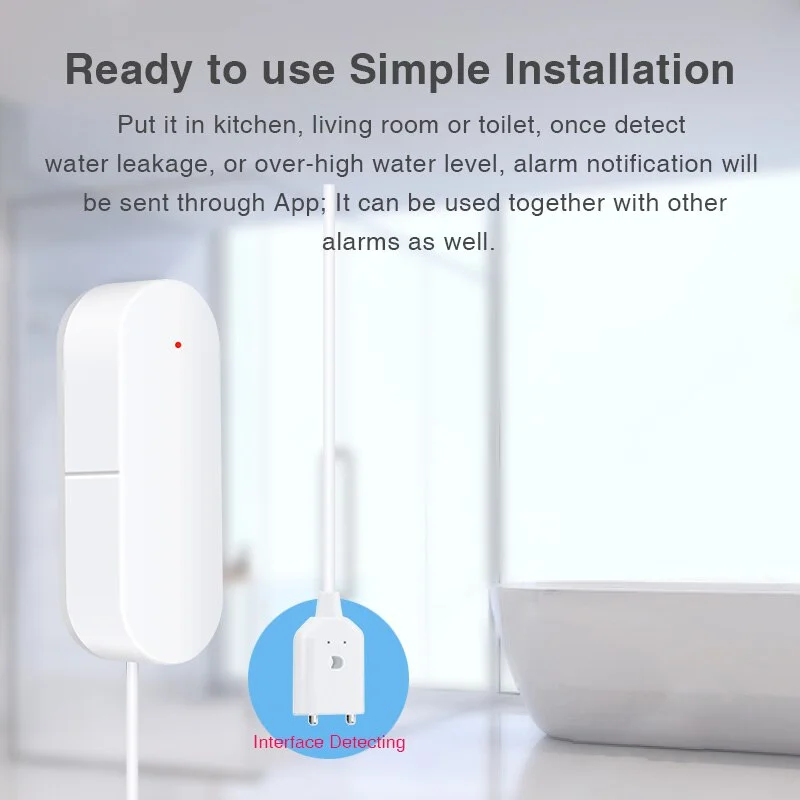 استفاده از این سنسور در آشپزخانه،کنار وان حمام،کنار سینک ظرفشویی،ماشین لباسشویی و ظرفشویی،آکواریوم و هرجایی که احتمال نشت آب و یا ترکیدگی لوله وجود دارد توصیه میشود.در صورت نشت آب سنسور بلافاصله آلارم دستگاه روشن شده و همچنین بر روی گوشی شما پیغام میفرستد تا اگر در منزل نیستید شما را از وجود نشتی آگاه کند،در صورتی که سناریو برای نشت آب تعریف کرده باشیم درصورت وجود تشخیص آب میتواند شیر برقی هوشمند را در ورودی شیر فلکه آب قطع کند. همچنین ازین سنسور میتوان برای اندازه نگه داشتن سطح آب در یک مقدار معین استفاده کرد و در صورتی که آب از سطح مورد نظر بالاتر بیاید آلارم روشن میشود. چند نمونه از وضعیتهایی که ممکن است روزمره اتفاق بیفتد و استفاده از این سنسور نیاز خواهد بود:هنگام بازی کردن بچه ها با آب،احتمال ترکیدن لوله ها،نشت آب مخزن ماهی (آکواریوم)،نشت آب در آشپزخانه یا حمام،سالمندانی که فراموش میکنند شیر آب را ببندند،در زمان قطعی آب،ممکن است شیر آب را باز کنیم و فراموش کنیم آنرا ببندیم و محل رو ترک کنیم.